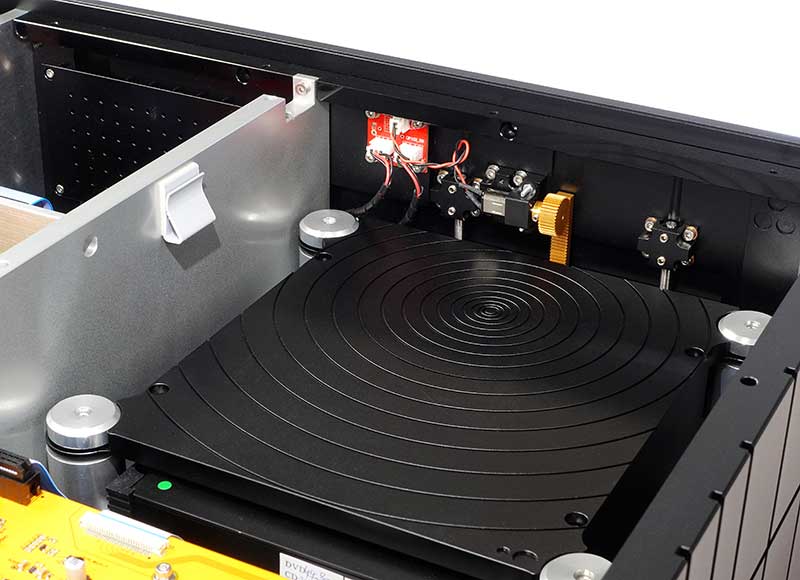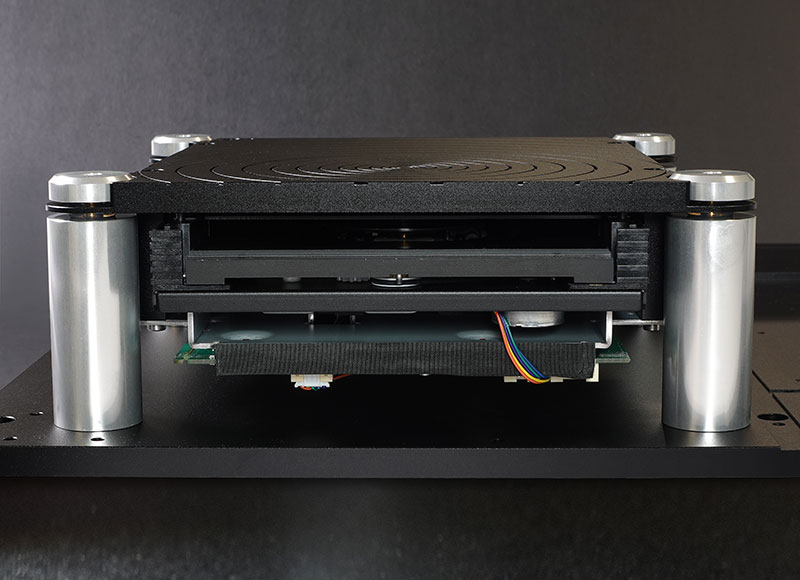 Das optische Disc-Antriebssystem des ORIGO ist ein hochgradig angepasstes Inhouse-Design. Das Schlüsseldesign ist die tiefe Schwerpunktfederung. Dieses Konzept wird häufig bei Plattenspieler-Design verwendet, es werden dadurch Schwingungen des Mediums CD und SACD gen Null reduziert.