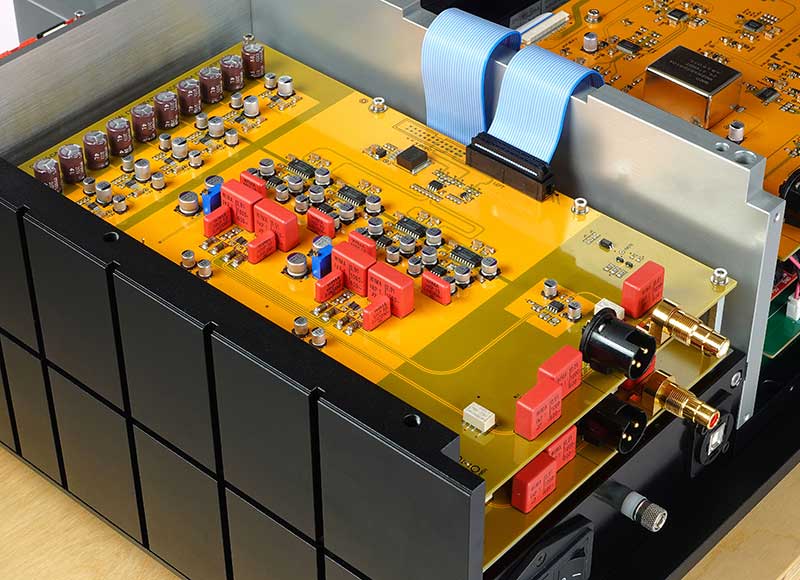 Vier dieser ausgewählten PCM1704K-DAC-Chips werden in jedem Kanal in einer parallelen Balanced-Konfiguration verwendet. Zwei DACs für die positive Phase und zwei DACs für die negative Phase. Die echte Balanced-Konfiguration, bei der die Referenzspannungen in jedem der positiven und negativen DACs miteinander gekreuzt sind, eliminiert funktional alle Common-Mode-Interferenzen. Die parallele DAC-Konfiguration minimiert den Residuen-Rauschpegel auf ein völlig neues, niedrigstes Niveau.