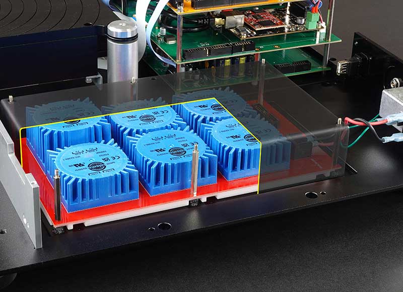 10 mm dicke, massive Aluminium-Motortüren bieten eine luftdichte Abschirmung gegen Außengeräusche. Zwischen den einzelnen Kammern, wie der Stromversorgung, dem Disc-Loader, dem Mikrocontroller, dem DSP und dem DAC, werden gefräste Aluminium-Trennwände und ferromagnetische Abschirmplatten verwendet. Die Kommunikation zwischen den nicht-audiobezogenen Schaltkreisen ist galvanisch durch eine kapazitive Barriere-Schnittstelle isoliert.
